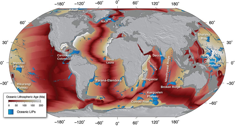 The map above shows oceanic LIPs — massive volcanic formations on the seafloor. These record additional pulses in the expansion sequence, preserved underwater. Arranged chronologically, they show the progression of crustal rupture: