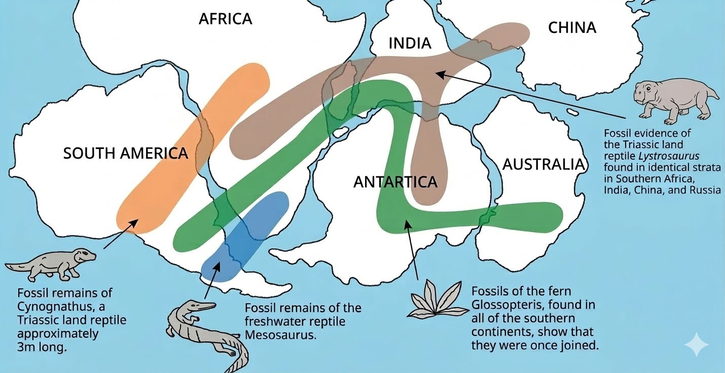 Glossopteris — a fern with seeds too heavy for wind or ocean dispersal — appears on all southern continents. Mesosaurus — a freshwater reptile that could not survive in salt water — is found in both South America and Africa. Lystrosaurus — a land-dwelling reptile — appears in Africa, India, and Antarctica. These distributions are impossible unless the continents were once connected by land, with no ocean barriers between them.